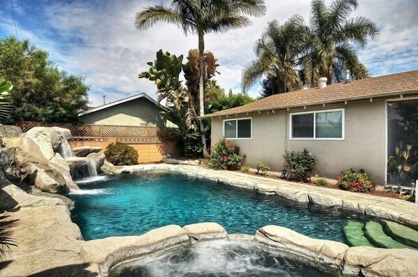 The fun doesn't end inside! The outdoor oasis is like your own private resort! Ride down the Water Slide! Swim in the pool with flowing Waterfall, and hidden falls ledge! Relax after a busy day at Disneyland in the bubbling Spa! You might have so much fun in the Pool, you won't want to leave!
