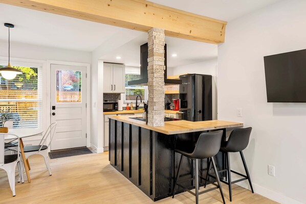 Sink into soft, plush memory foam mattresses, hypoallergenic down alternative microfiber comforter, crisp clean linens, and extra blankets for the winter in each of our bedrooms. Stay rested with blackout drapes in each bedroom.