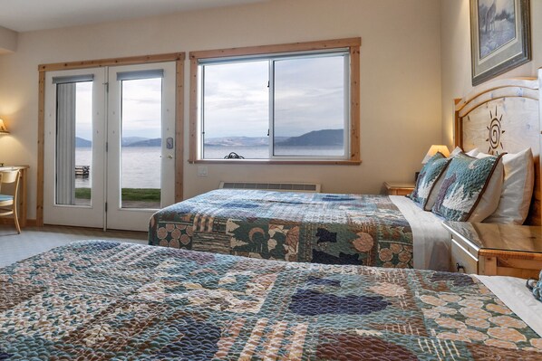 This rustic waterfront studio apartment at Many Springs Resort is a cozy retreat nestled just outside the picturesque town of Bigfork, Montana, offering breathtaking views of Yellow Bay on Flathead Lake. This charming space is designed to provide comfort and convenience in a compact yet inviting setting. Step outside onto your private waterfront balcony to experience the true beauty of this location. A cozy patio table and chairs offers the perfect spot to sip your morning coffee or enjoy an alfresco meal while gazing at the white capped waters of Flathead Lake. The tranquil sound of lapping waves and the scent of pine trees in the air create an idyllic setting for relaxation.