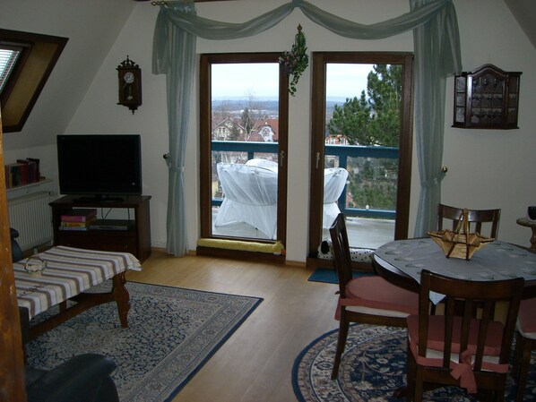1 large living room, 2 bedrooms with 2 beds eachExklusive and comfortable apartment in the 2. Floor of a complex and with great attention to detail completely renovated Art Nouveau villa. The apartment comprises the entire floor. Approximately 1900 sqm park-like grounds. Fully equipped kitchen with hob, oven, microwave, toaster, coffee maker, egg cooker, kettle, bread slicer, refrigerator, freezer. Large bathroom with bath, shower and hair dryer. Entree and living room with eco-bamboo flooring. Both bedrooms Oeko-Tex carpet. Antique furniture in the living room, solid wood furniture in bedroom and kitchen. Disc righteous mattresses. Large balcony with breathtaking view (on a clear day about 35 km). The city center is 10 minutes away. Optimal starting point for hiking, walking, cycling and car routes. Bed linen is not up to 5 nights, optional, a linen package for one fold 5.00 € be booked per person. From the 6 night bed linen is included.