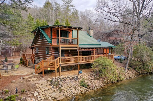The cabin has three comfortable, cozy bedrooms. Upstairs you'll find the master suite with a king bed, a 40” flatscreen TV, a private balcony overlooking the river and a private bathroom with walk-in shower. The main level bedroom has a queen bed, a private bathroom and walk-in shower. The second bedroom on the main level has a pair of twin beds and a separate bath with tub/shower combo.