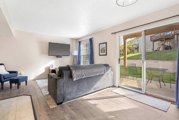 The home’s cozy interior is the perfect setting for spending your downtime, meticulously curated with your ultimate comfort and relaxation in mind. Sink into plush sofa or armchair seating while you queue up a new movie or stream your favorite shows on the smart TV. The efficient kitchen is well-equipped for all your culinary endeavors, showcasing stainless steel appliances and ample cabinetry stocked with cookware and dining ware. The chic dining table can seat 4 for formal meals while a café table for 2 awaits on the patio for dining al fresco in the fresh Ozark air.