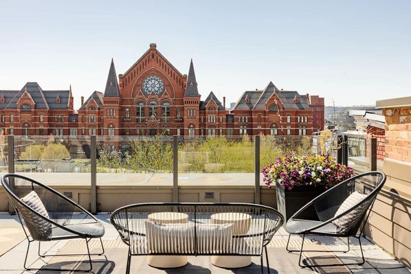 The rooftop patio, accessed by elevator, is one of the best in the city -- please note that it is shared with other guests. The parking is across the street and is free using the parking pass that we provide at no cost!