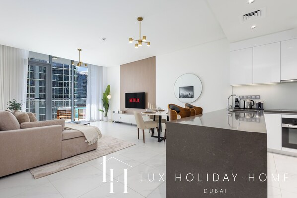 LUX | 2BR Lagoon View – District One, 10–15 min Burj Khalifa provides a free kid's club and more. Guests can connect to free in-room WiFi.