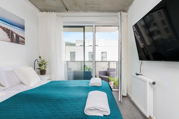 Double bed, bedding, bedside tables, bedside lamps, wardrobe, TV, exit to the balcony