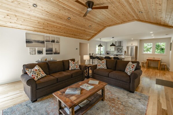 The modern kitchen is the heart of the home, with seating for four at the large bar. Its open concept allows guests to enjoy a fire in the stone fireplace while preparing gourmet meals. All new appliances and plenty of counter space make entertaining easy. The living room features comfy couches, a flat-screen TV, and beautiful design elements, including a stunning ceiling and rustic floors, creating a cozy yet modern space to unwind.