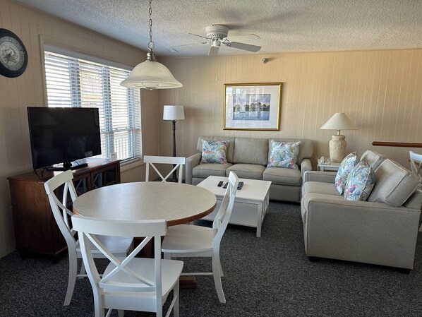 Fully equipped kitchen has 2 dining tables, plus an additional counter with stools which is laptop friendly - a great work area (if you must). And the round table is nice for cards, games or puzzles. Unit has 2 decks with table and chairs. Or eat at the picnic tables located near the charcoal and gas grills. Can walk to b/l/d restaurants and nightlife music, and even to get pizza or home made ice cream!