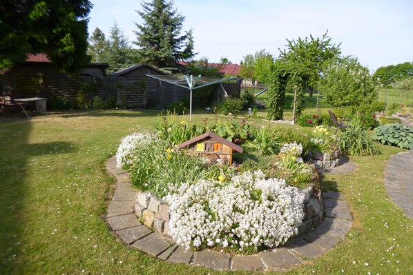 You spend the night in three comfortably furnished double rooms with private shower or Full bath. On the morning following the smell of coffee and take part in the beautifully set breakfast table. Overlooks the loggia on the 150 m distant Boddengewaesser with the island of Ruegen in the background. Start your day with a good breakfast, with daily changing menu. On Sunday, there is the home-made cakes. You talk as desired with the other guests or like to hear from me more information on walks and excursions. Or just enjoy the beautiful garden with its many flowers and the little goldfish pond a good opportunity to explore the surrounding countryside. Of course there is also a free car park for each room.
