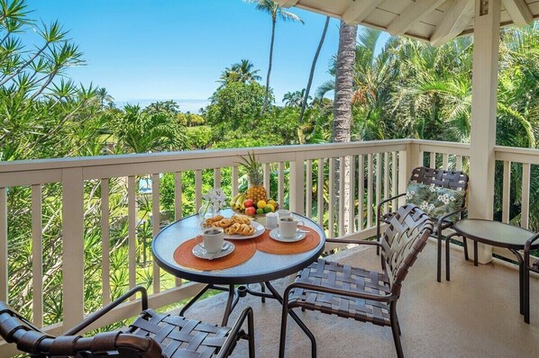 With three bedrooms and baths, there is plenty of space to sleep your group of up to six people. The master bedroom has a king-size bed, a bathroom en suite, and a jacuzzi tub. It also features its private lanai surrounded by plumeria trees. The first guest bedroom has two twin beds (which can be converted to a king if need be,) and shares the downstairs guest bathroom. Need more space? No problem! The loft bedroom has a king-size bed and a private bathroom.