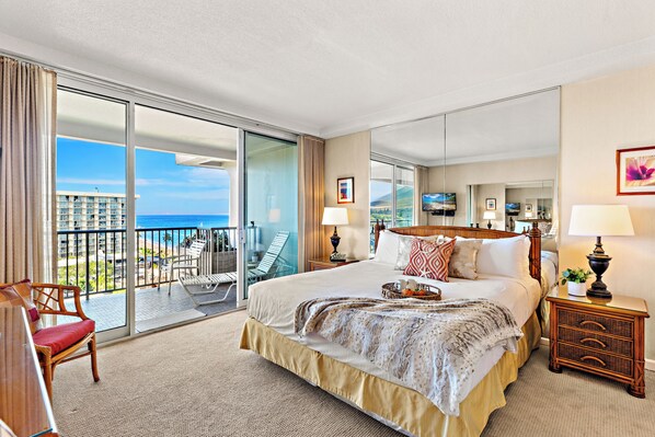 On Kaanapali Beach, this one-bedroom suite offers a beautiful Pacific view. With two bathrooms, a living area, fully equipped kitchen and private balcony you can unwind in paradise. The paved beach walk is at your doorstep for exploring or stroll by the Koi Pond.