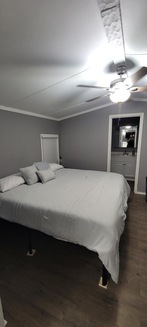 Awesome stay! I was a little nervous to stay here bc It was a new listing with no reviews. Also, I had never stayed in a mobile home before and was worried about safety. But when we arrived, I was blown away at how nice it was on the inside and how cute it was decorated! We felt very safe the whole time. The home is on a bit of land so it has a very country feel. We took some cute pictures by the cactus and shipping container! We were here for my son’s college graduation. My parents did not have luck finding a hotel room for the busy graduation weekend so they stayed with us as well. There was plenty of room for all of us ( 5 adults, 1 teen, and 1 toddler. 3 bedrooms, 2 bathrooms what more could you need? The owner was very nice and responsive to all of my questions, even provided some restaurant recommendations. He left us bottles of water in the cabinet and there were a jar of snacks. Also, there was a coffee maker and pots and pans for us to make breakfast. The AC is loud, but I don’t mind as I love white noise and my toddler thought it was hilarious to stand on the AC vents. He also loved playing on the Lonestar Rug! The master king beef is firm, the other king bed soft. The queen bed is a sleep number bed but my sister didn’t know how to adjust it. We had a fun time!!!