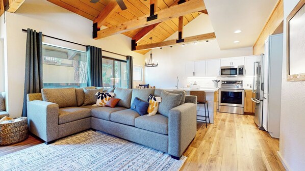 Enjoy this mountain retreat located in a quiet complex, close to the Sierra Star Golf Course & Mammoth Mountain! Relax in the fully renovated 1 bedroom + enclosed loft, 2 bath cabin. This end unit offers a private entry and two story floor plan. On the main level, the living room offers a wood burning fireplace, large comfortable sectional and a 55" flat-screen smart RokuTV with YouTube TV. Enjoy your morning coffee in the corner window bench seat while taking in the forest views. The fully renovated kitchen offers quartz counters, KitchenAid stainless steel appliances, and is fully stocked with everything you will need to prepare family meals. The dining area offers seating for 6 with additional bar seating for 3, an open floor plan for cooking/dining/living as well as a private balcony. Also on the main floor, the primary bedroom features a King bed with Nectar mattress and a full bathroom with soaking tub/shower combo in the hall. The upstairs, large open loft is comfortable for the kiddos or a family, featuring a Nectar mattress queen bed and an additional bunk bed with a double Nectar mattress on the bottom and a twin mattress on top. The loft has a large walk-in closet, and a full bathroom with tiled shower. The condo has a private key code entry and assigned shared garage parking for one car (garage clearance is 7' 3"). The Bigwood community has excellent amenities including a year-round outdoor large Jacuzzi, community BBQ, outdoor heated pool (summer months only), Sauna and laundry room. Bigwood is located1 mile to Eagle Lodge, 1.5 Miles to Canyon Lodge, 5 miles from Main Lodge and conveniently located close to the Yellow shuttle, perfect for getting around town! This non-smoking unit sleeps a maximum of 6 and is not pet friendly. All guests receive complimentary full access to Snowcreek Athletic Club to enjoy facilities including indoor heated pool, steam/sauna, full fitness facility, yoga, pilates and cycle studio and more. Guests will be provided two parking passes. If more parking is required than what is allotted, feel free to call our office for alternative options. Our calendar is updated in real time. There are approx. 20 steps to access the entry, and two levels inside. PLEASE NOTE: This property makes use of surveillance equipment outside the home. There is a camera in the front of the home monitoring the front door. (Certified Property #: TOML-CPAN-13974) Unit Code = BGW045