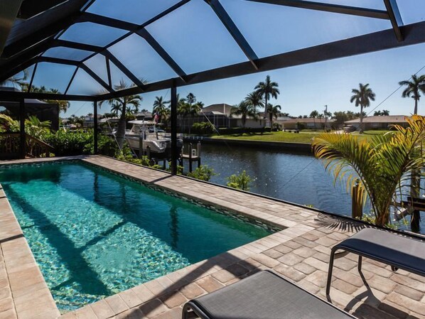 and canal with its own slider to the lanai. It is attached to an en suite bathroom with double vanity, walk