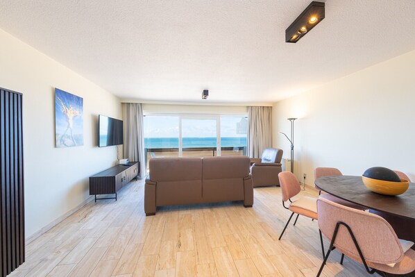 Apartment on the fifth floor, ideal for a comfortable seaside holiday. It features two bedrooms with double beds, perfect for families or couples traveling together. The bright and spacious living room with large windows creates a pleasant atmosphere and opens onto a terrace with beautiful sea view. The fully equipped open kitchen provides everything needed for cooking and enjoying meals together. The renovated bathroom with shower and separate toilet offer additional convenience. At the back, there is a sunny terrace overlooking the countryside, perfect for relaxing and unwinding. With its modern design, natural light, and two terraces, this apartment combines comfort, style, and an excellent location – the perfect base for an unforgettable holiday at the Belgian coast. Wifi: yes - parking: included - sheets: bring your own - towels: bring your own.