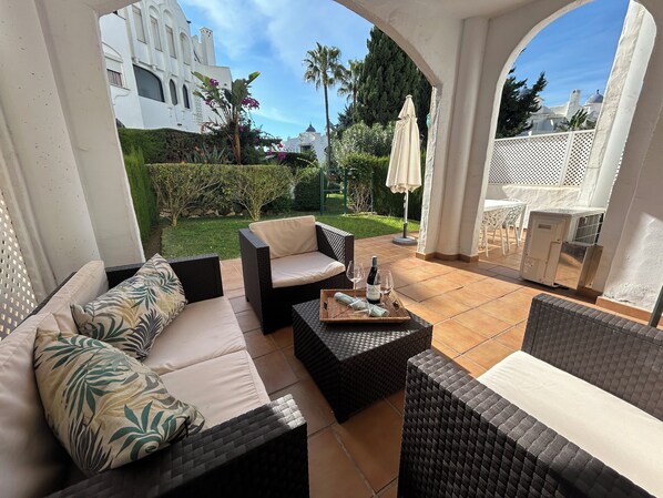 Terrace/patio - Apartment with garden in Urb/Medina del Zoco, Mijas Costa: 5 min beach and swimming pool (Calahonda)