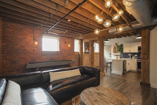 Tobacco ONE is made up of Tobacco 208 (a 3-bedroom, 2-bathroom unit) and Tobacco 309 (a 1-bedroom, 1-bathroom unit), which can be rented together to accommodate up to 9 guests. Located in the same building, these two units are connected by a set of stairs inside the historic 1865 Tobacco Warehouse. Please note that while Tobacco 309 is directly above Tobacco 208, there is no direct doorway between the two units; guests will need to enter the stairwell or take the elevator to access the accompanying unit.