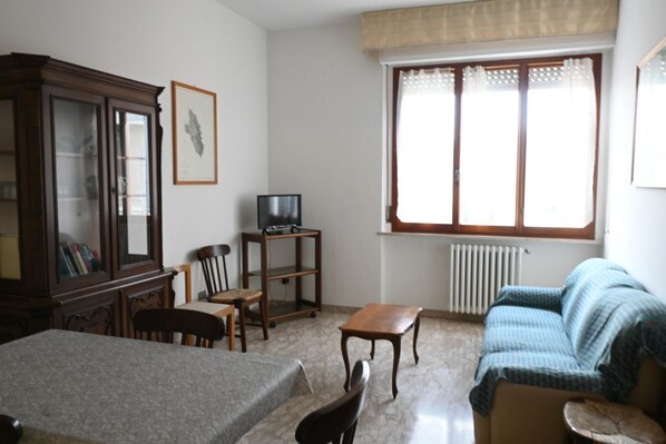 Description: second floor of a building overlooking the historic center. Spacious living room with sofa and dining table - separate kitchen with dishwasher - master bedroom with double bed - second bedroom with two single beds - third bedroom with a single bed - bathroom with shower cubicle and washing machine.