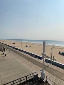 Beachfront and on the Boardwalk! Down around 21st street, so plenty of action, but not too loud. In a special spot of the beach where you'll never have to fight for a spot on the sand. Come out when you want to! Relax on the third floor where you can hear the ocean waves and peoplewatch the Boardwalk.. 24' double sized Balcony provides ample space for you and your family. Comfortable central-air and elevator access.