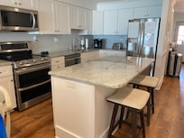 Gourmet kitchen contains a built-in booth for seating and additional seating at island. New appliances. Keurig, Toaster, Dual Oven. New Appliances.