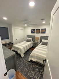 2nd Bedroom- Twin Beds that can convert to King with wedge (though this room functions better as Two Twin Beds, wedge is a stopgap). Also has a ceiling fan and streaming TV.