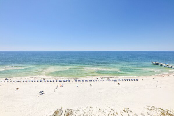 Admiral Quarters penthouse condo offers a serene getaway with an unobstructed view of the Gulf and white sands of Orange Beach. Enjoy dolphins playing in the surf from your spacious balcony, or unwind at either the indoor or outdoor pool.