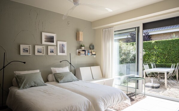 The ground floor studio (35m2) is tastefully decorated and offers accommodation for 2 people (+ possibly 3rd person). The sitting / sleeping area opens onto the private garden through the large sliding windows.