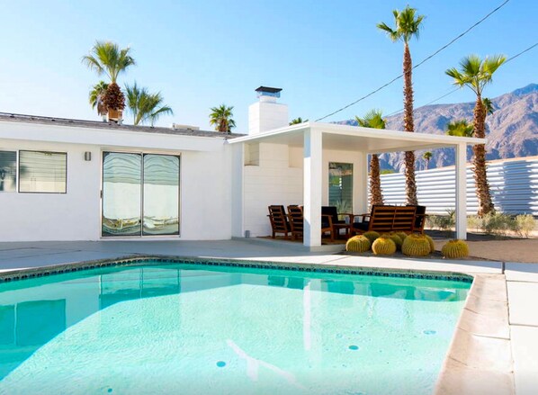 The lovely gardens with their mountain views have been re-designed and restored by William Kopelk, who also was responsible for the famous Mid-Century gardens of Neutra's Kaufmann House. Designed in low-irrigation desert style there is a small grassed area with lemon trees at the rear, fire pit and BBQ. The pool is heated (optional extra heating charge $55 a day) and is totally private.
