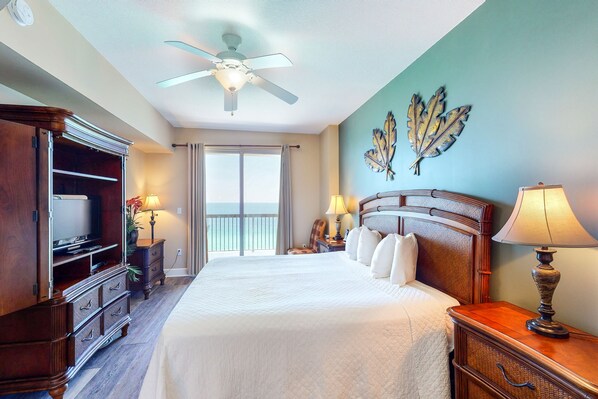 This beachfront condo features a private, furnished balcony that's accessible via two separate sets of sliding glass doors. Additional features include a well-equipped kitchen, spacious living area, and comfortable dining area for meals or family game nights. Guests of Sunrise Beach will also enjoy plenty of amenities including an elevated, Gulf-front sundeck with two tropical pools (one seasonally heated), relaxing spas, a children's water play area, exercise room, meeting room, and convenient covered parking.