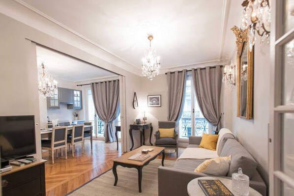 From the moment you step into our stunning 2-bedroom Monthélie vacation rental apartment you will feel right at home. A spacious living room leads to an open plan kitchen and dining room, providing the perfect place for you to enjoy your Paris stay in comfort. Leading off of the living room is a charming balcony with views of the Eiffel Tower nearby. With 2 comfortable bedrooms and bathrooms plus a dining room and fully equipped kitchen, this apartment effortlessly combines French décor and modern luxury. Whether you catch up with friends and family with a chic dinner “chez vous” or simply enjoy a coffee on the balcony to enjoy the view, the Monthélie apartment will make your time in Paris truly memorable.