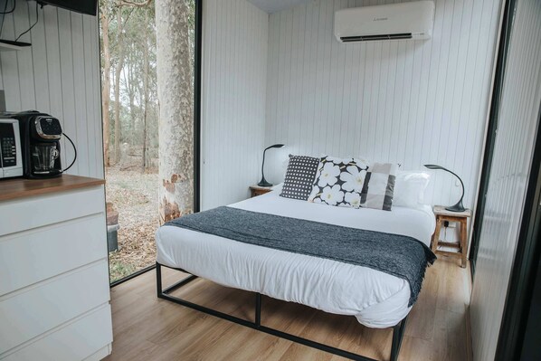 Escape to the award-winning Vintry property in Central Pokolbin, Hunter Valley. Our tiny house is a charming retreat with an equipped kitchenette and ensuite bathroom. Enjoy hot showers and air conditioning amidst the picturesque vineyards of NSW.
