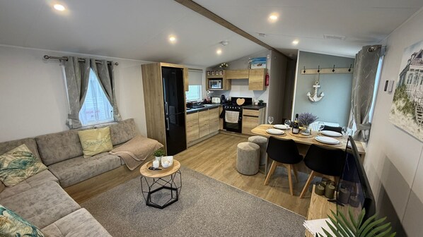 Spacious caravan for 8 at Camber Sands – free WiFi, Netflix, parking, close to beach and local attractions. Comfortable interiors, fully equipped kitchen, outdoor seating, perfect for family holidays and relaxing getaways.