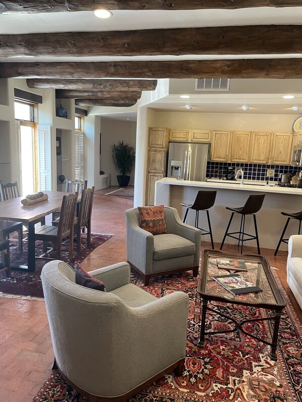 In downtown Santa Fe, this beautifully furnished luxury home & casita offers a gourmet kitchen and rooftop deck perfect for al fresco grilling with sunset views. With a separate entrance to the casita featuring its own private patio, enjoy 3 bathrooms and WiFi throughout.