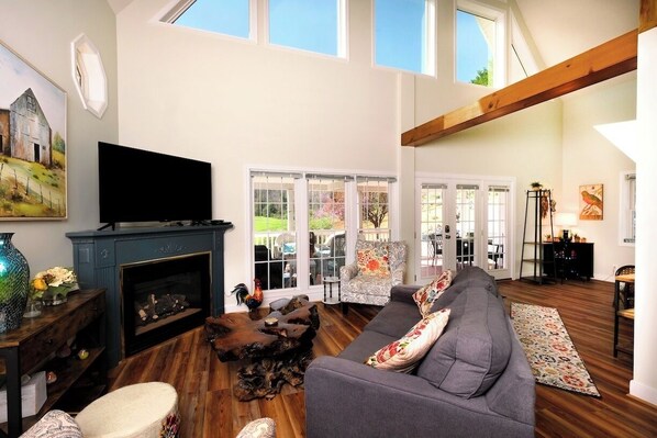 Windy Knoll invites you to come and relax and enjoy the stunning views of the Afton Mountain greenery. Large A-Frame windows allow the sunlight to come through so you can enjoy the birds and nature all around. The property sits on 3.5 acres so it is very private. An expansive rolling lawn in the front to enjoy watching the deer in the morning while having a cup of coffee on the wide front porch. Forest areas on the side and back of the house. Enter the home in the front door and a warm and welcoming living room await you with a couch, 2 comfortable chairs, and a gas burning fireplace. Throw blankets and pillows for snuggling while watching a movie. TV and DVD player with a selection of movies to choose from. The dining room with bay seated window has a large table to seat 6 comfortably. The front porch also has a dining table. Spacious, well appointed kitchen with all you need for preparing delicious meals after a day of hiking the Appalachian trail or sightseeing. Dish-ware, flatware, sauce and saute pans. Wine glasses, coffee mugs, serving ware. Crock pot, blender, mixer. Coffee pot with coffee bean grinder (Starbucks coffee beans in the pantry). You will find a few condiments in the refrigerator, spices, herbs, oil in the pantry. The loft bedroom has a Queen bed and a Double Bed with a private bathroom and shower. The first floor bedroom has two twin beds and a separate bathroom with walk in shower. Loft area also has a desk with laptop and printer for your use. Back deck has a grill all ready for those barbecues!