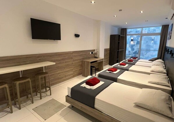 This Studio Apartment accommodates a standard of 5 people (single beds), a kitchenette (electric stove, kettle, mini fridge, microwave), a TV, a small dining counter, and a bathroom. This apartment is on the lower ground floor and has a terrace.