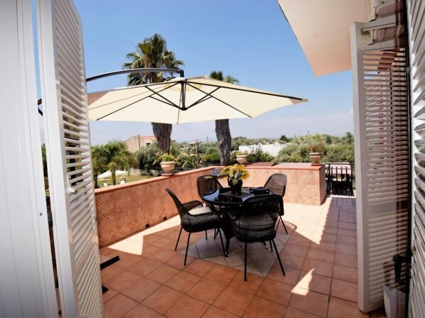 3-family house. 13 km from the centre of Siracusa, 2 km from the centre of Floridia, in a quiet, sunny position, 13 km from the sea, 20 km from the beach. For shared use: property 2'500 m2 (fenced), garden 700 m2, swimming pool (6 x 12 m, depth 120 - 140 cm, seasonal availability: 01.May. - 31.Oct. pool opening hours: 09:00-13:00 and 16:00-19:00). Outdoor shower, arbour (9 m2), garden furniture, barbecue, pool maintenance by the owner/gardener. Heating to be paid on the spot (01.Apr. - 30.Nov.). Airport transfer (extra). Parking on the premises. Grocery 1.2 km, supermarket 1.5 km, restaurant 1.3 km, bar 1.2 km, bus stop 12 km, sandy beach "Arenella" 20 km. Nearby attractions: Avola 30 km, Riserva Naturale di Pantalica 30 km, Noto 40 km. Please note: car recommended. Residence with electric gates. The owner lives in the same residence. Guided excursions, car rental with driver on request Extra.
