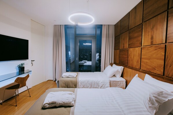 Two bedroom apartment with modern design and unique panoramic views of the city Tbilisi. The apartment is fully equipped with the necessary equipment and resources. Every detail of the apartment is designed for a comfortable and pleasant stay