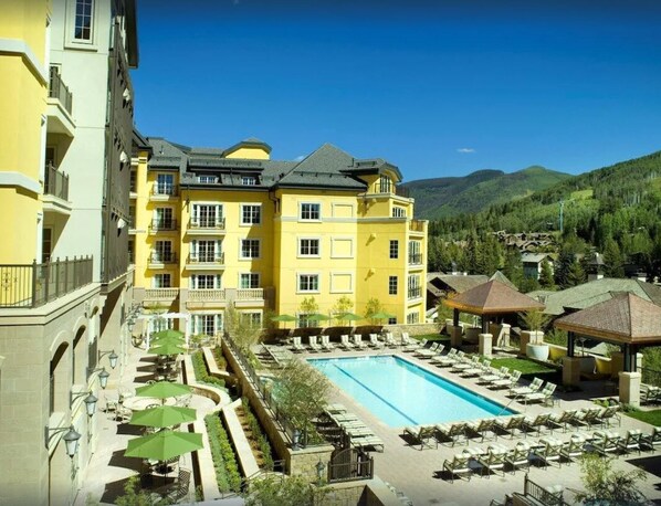 The Ritz-Carlton at Vail Mountain's base offers a luxurious retreat in Colorado. Guests enjoy elegant furnishings, private balconies with mountain views, fine dining, shopping access, and in-room WiFi. Ideal for active skiers and peaceful getaways.
