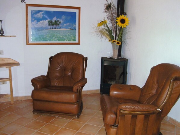 The living room has a large room with a mezzanine, the double bed is located below, there is a reserved area with table, sofa and bookcase without forgetting the television and a radio.