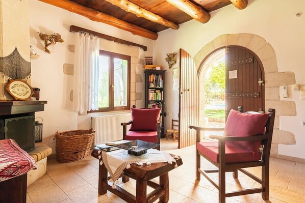 Your stay will enable you to escape from routine, resting by the fire place in the comfortable open-plan sitting room, with a view of the swimming pool and the luxuriant garden, where you can sip your wine, read, play board games or do whatever you like. You can also enjoy a hydro massage in the spacious bathroom or take a rest on the terrace, enjoying the view of the Apokoronas area or relax on the swing in the garden among the various plants and olive trees.