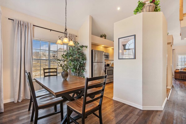 When you arrive at Meadow Brook Resort Getaway, head right onto the screened-in balcony and let the fresh Ozark air welcome you to your retreat. With a comfortable seating area and a table for four, this is the perfect spot to sip your morning coffee or savor breakfast alfresco while overlooking the peaceful surroundings. Inside, the heart of the home is the kitchen, where granite countertops, stainless steel appliances, and counter seating for four make meal prep a breeze. Whether you're brewing your favorite coffee at the drip and Keurig coffee station or gathering around the dining table for six, every meal feels special in this beautifully designed space.