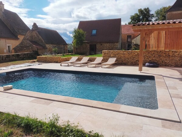 Cette maison de campagne idéale pour 6-7 personnes et jusqu'à 9 places, datant du 18e siècle est entièrement restaurée avec goût : cour privative, terrasse ombragée et belle zone de repos avec piscine sur le terrain attenant !