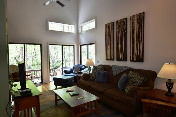 This home sleeps up to 8 and still leaves enough room for everyone there to have their own space. The master bedroom is located upstairs with an amazing king bed. In the master bedroom you have corner windows that have views of the waterfall, there is also a fireplace that once you light it and open your windows for the views you will never want to leave the room. The master bathroom has a private bath with large walk in shower. The second bedroom is on the main level with a full size bed and cute spiral stairway that lead to loft area in the same suite. The loft has a full size bed perfect for young children. The third bedroom has a queen and door to outside deck.