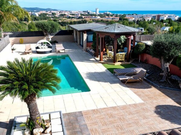 Modern, comfortable house, 3 storeys. In a quiet, sunny position residential area (villas), 650 m from the sea, from the beach. Private: property (fenced), swimming pool angular (5 x 11 m, depth 100 - 180 cm, seasonal availability: 15.Jun. - 15.Sep.). Outdoor shower, terrace, garden furniture, barbecue. In the house: washing machine, tumble dryer. Public parking on the road. Supermarket 700 m, restaurant 450 m, bar 750 m, bakery 800 m, bus stop "Sant Vicenc de Calders" 3 km, railway station "Sant vicenc de Calders" 3 km. Nearby attractions: Barcelona 71 km, Sitges 35 km, Tarragona 27 km, Port Aventura 40 km. The owner does not accept any youth groups. Neighbourhood highly sensitive to noise. Quietness and good behaviour expected.