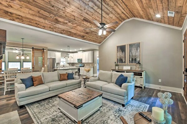 4 Smart TVs (family room 70”), gigantic pantry room with wooden shelving & additional counter space and cabinets, real wood-burning fireplace (wood provided seasonally), dining table, ceiling fans, game room w/air hockey table, wall-mounted Connect 4, board games