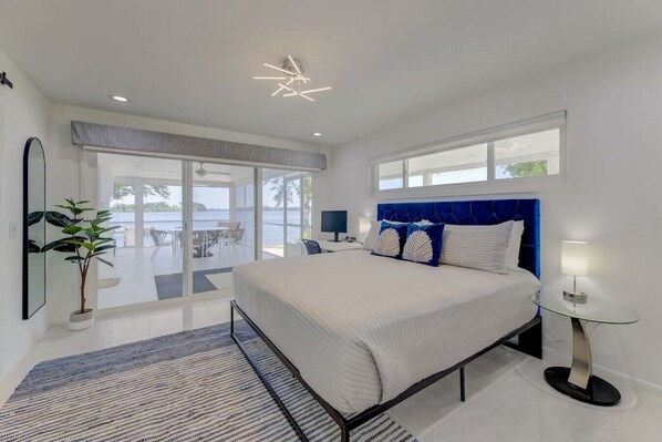 The primary bedroom is furnished with a king bed. There are plenty of windows providing a lot of natural light as well as a sliding glass door for you to enter the porch. Even from bed, you can enjoy the amazing views that this house offers. There is a desk with a monitor in the primary bedroom for any business travel.
