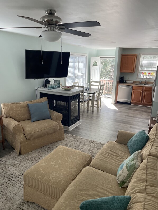 There is a spacious front screened in porch to have morning coffee or relax after a fun day of adventures. It’s furnished with a comfortable conversation set and lights to enjoy in the evening.