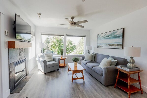 The living room features a fireplace, Smart TV, and pictures windows with gorgeous views of the ocean and the westcoast surroundings. Guests can enjoy year-round access to the covered deck from the living room. The deck is furniture with 4 outdoor chairs and a patio table.