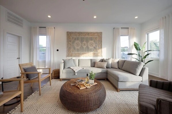 - The main living space boasts the most gorgeous design and furnishings with plenty of seating for your group, along with a smart TV for your enjoyment.
