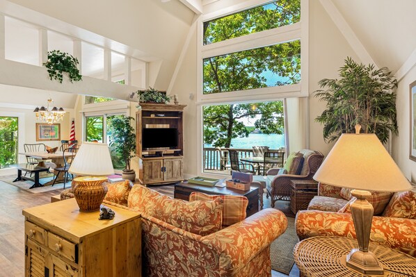 Upon entry, you'll be met with a bright interior and a cozy atmosphere throughout the well-appointed living area. Make yourself at home at Grammy & Papa's by resting on the plush furniture, streaming your favorite movies on the large TV, or serving brunch on one of the expansive decks. The open concept floor plan was designed with togetherness in mind, so no conversation will be lost here. Prepare grand meals and lake picnic snacks in the sophisticated kitchen, equipped with updated appliances, a wine fridge, a breakfast bar, ample cupboard room, and a formal dining table. There's room enough for everyone with comfortable beds in five spacious bedrooms, with a sofa bed for optimal room.
