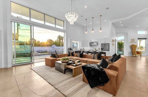 The gourmet kitchen blends with the dining area, offering a place to cook and enjoy tasty delicacies before unwinding in the entertaining living room, setting the scene for unforgettable evenings. Sunlight bursts through large backyard doors and picture windows, touching the designer details, custom-tailored furniture, and unique hand-designed plaster painting by Italian designer Angelo Buonvincino, further enhancing the luxurious "Miracle" ambiance under the majestic 18-foot ceilings.